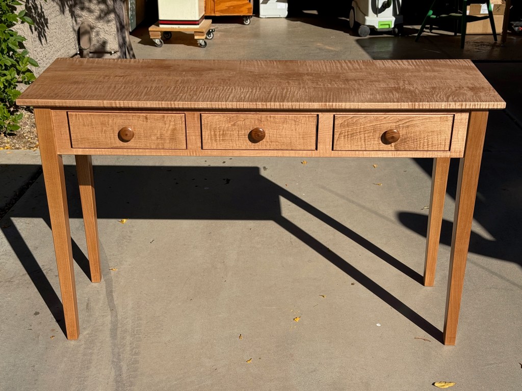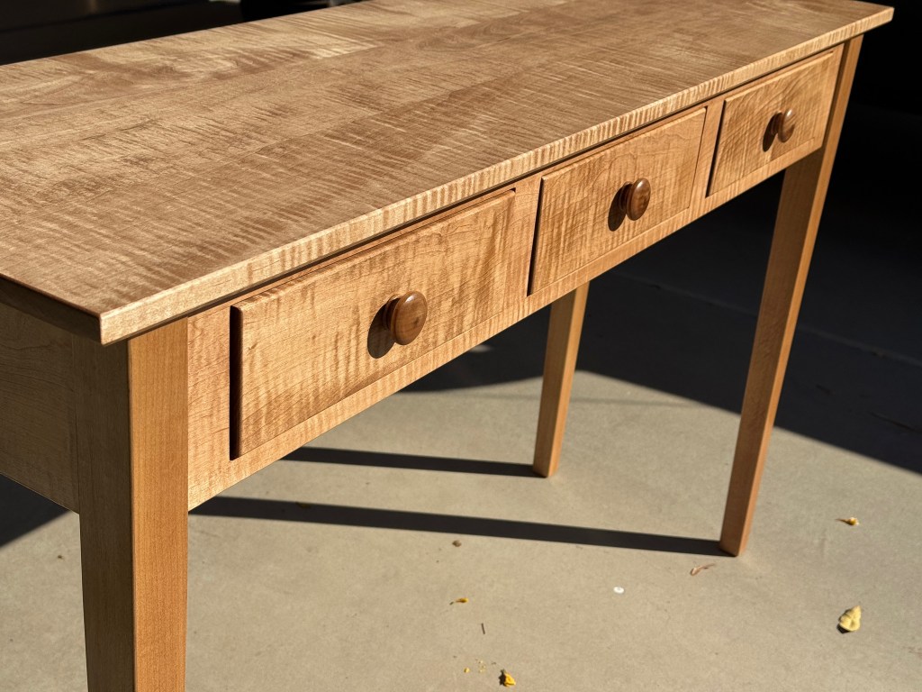 Entryway / Sofa table with 3 drawers made from curly maple.