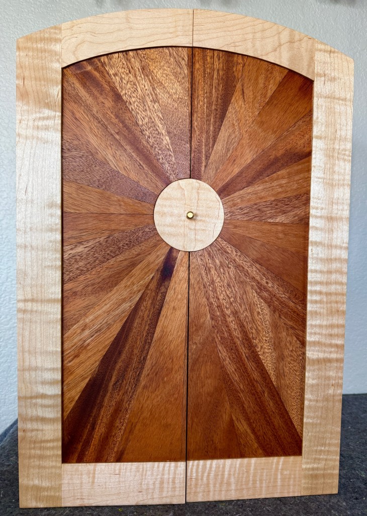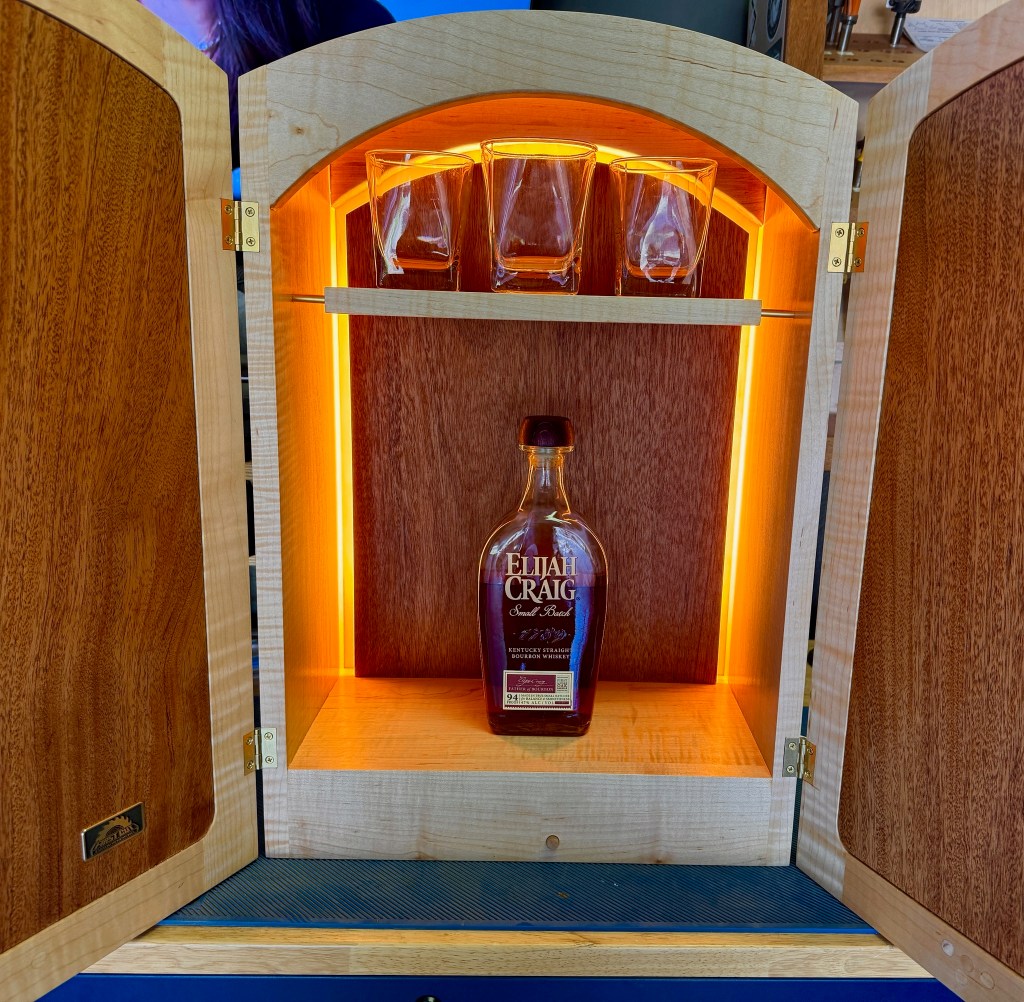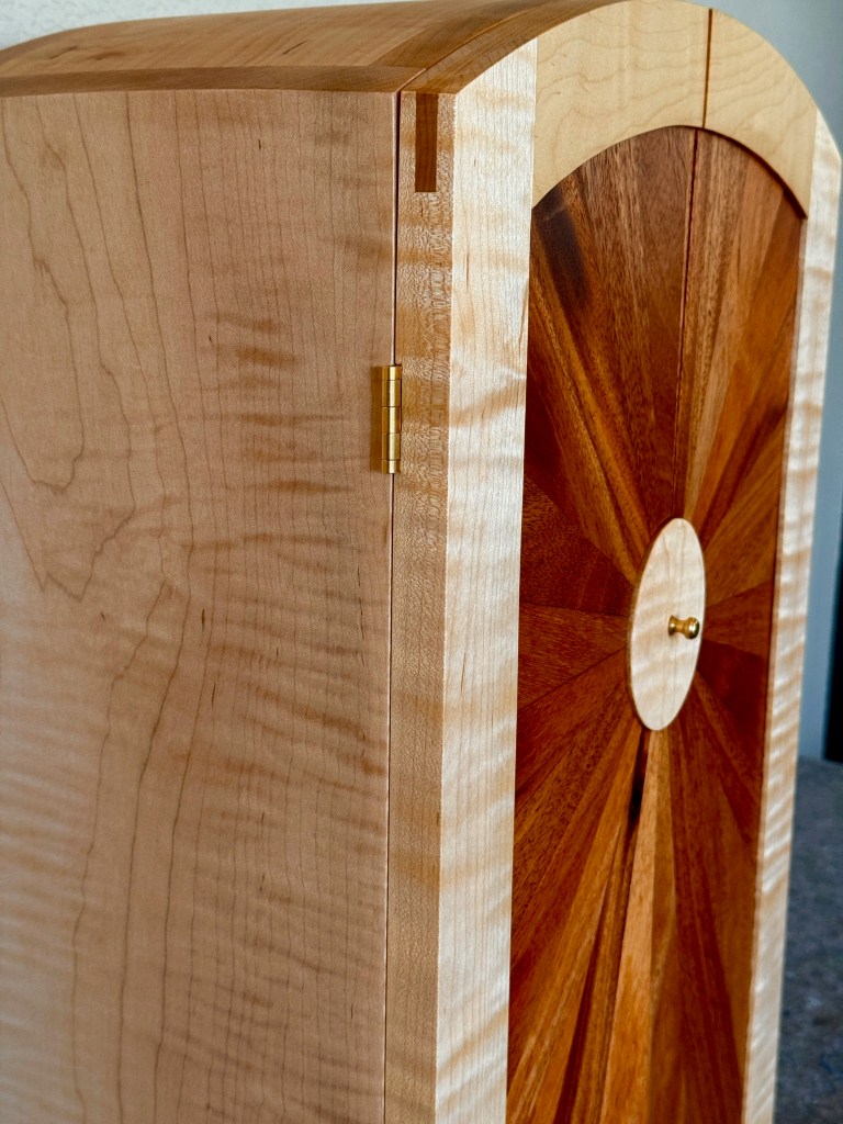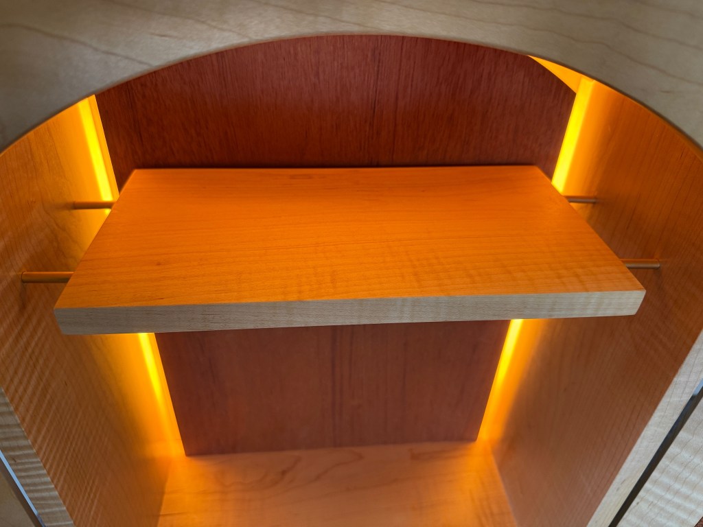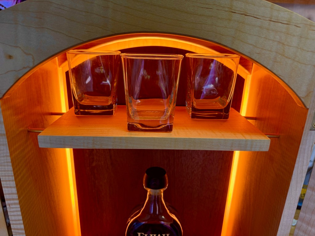 Whisky cabinet with shelf and light up backdrop. Made from curly maple and African mahogany.
