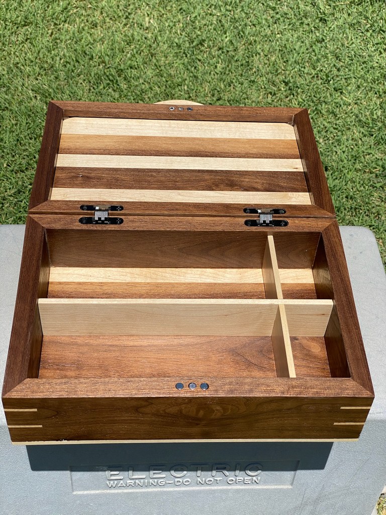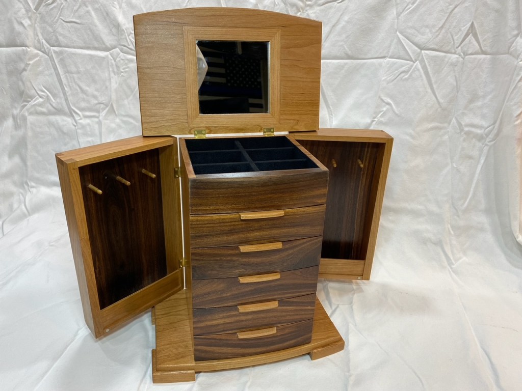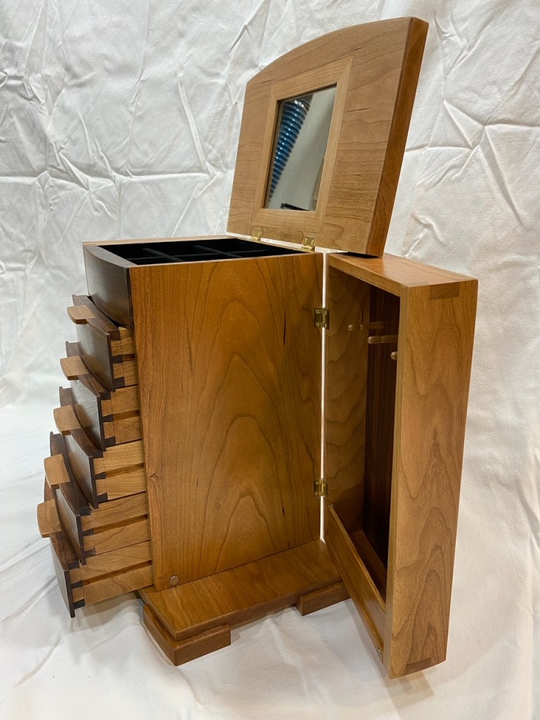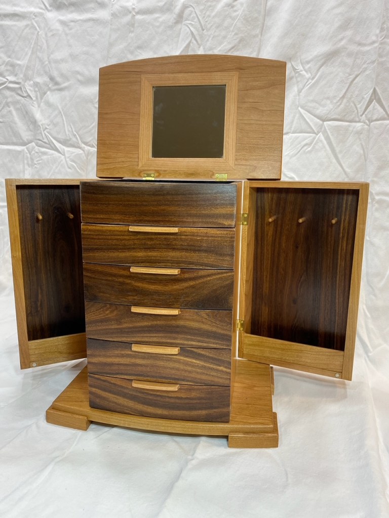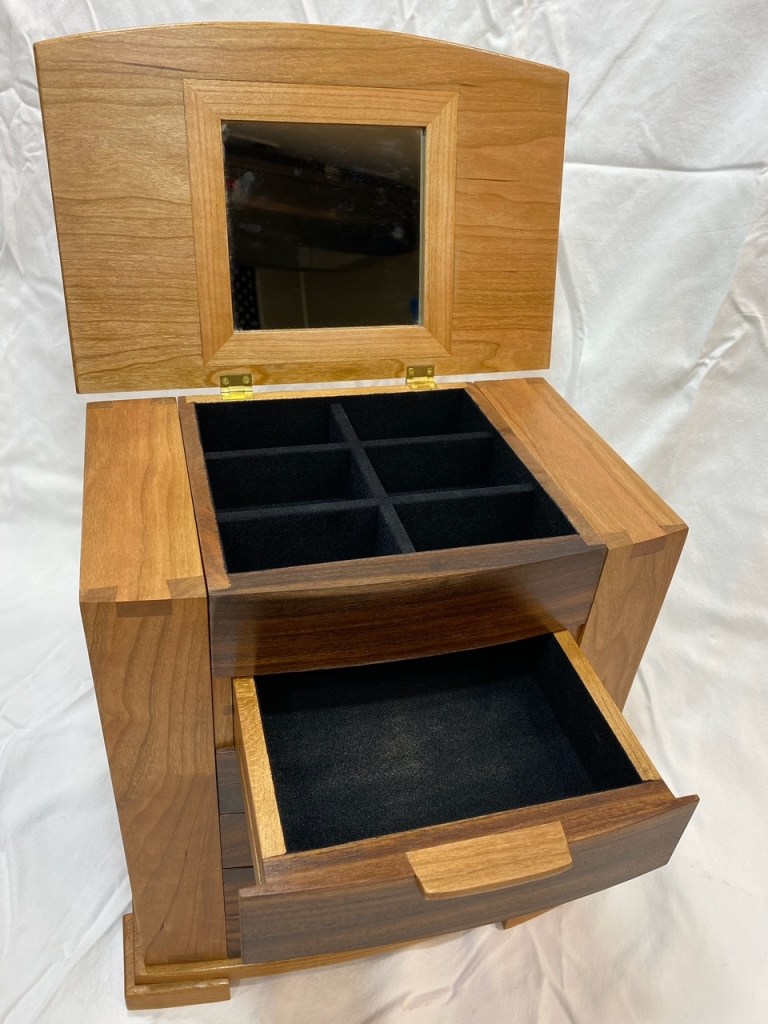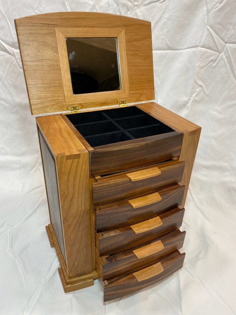 This is a Wood Whisperer designed Jewelry box made from cherry and willow acacia with suede flocking in all the drawers and dovetail details