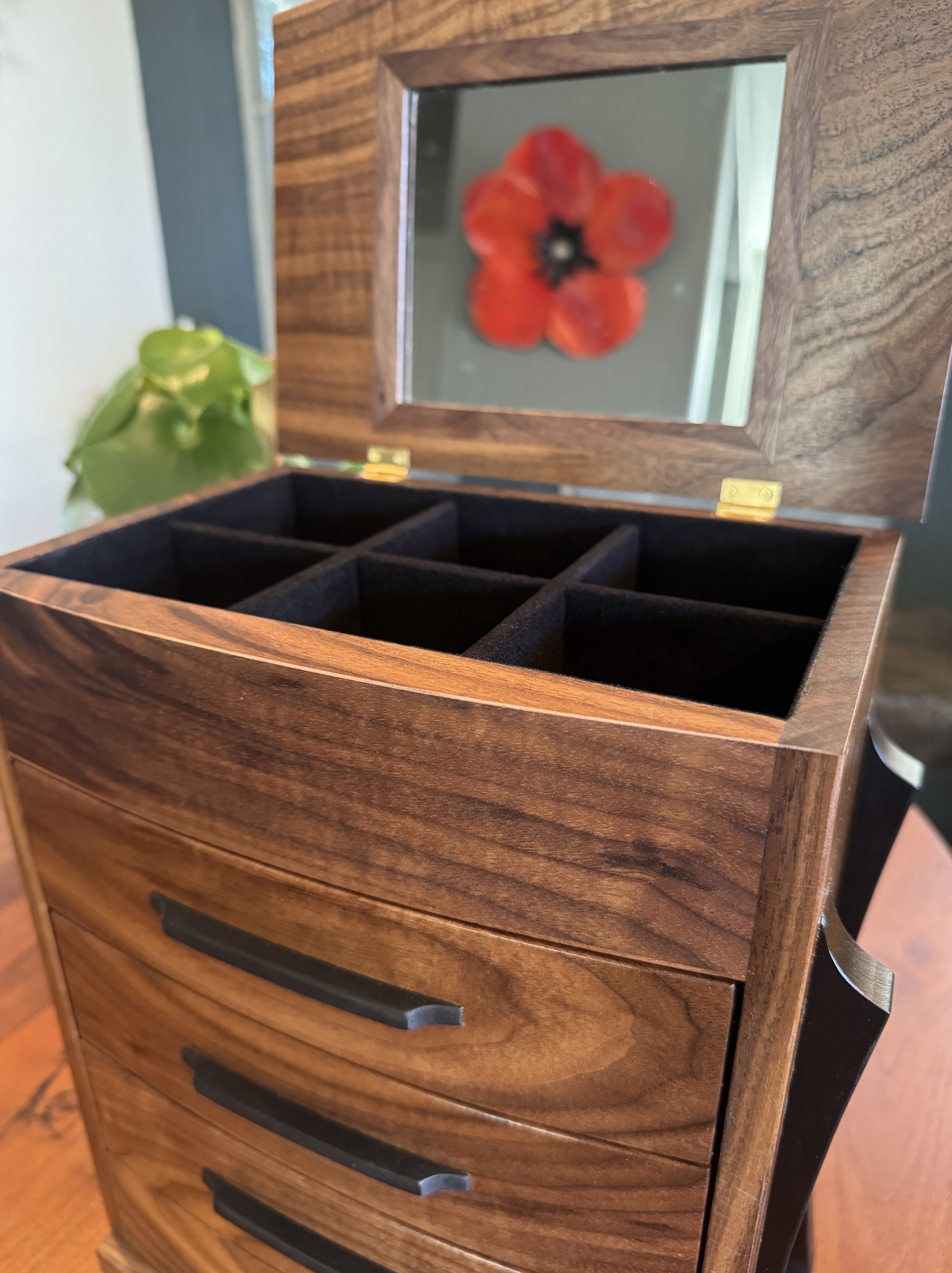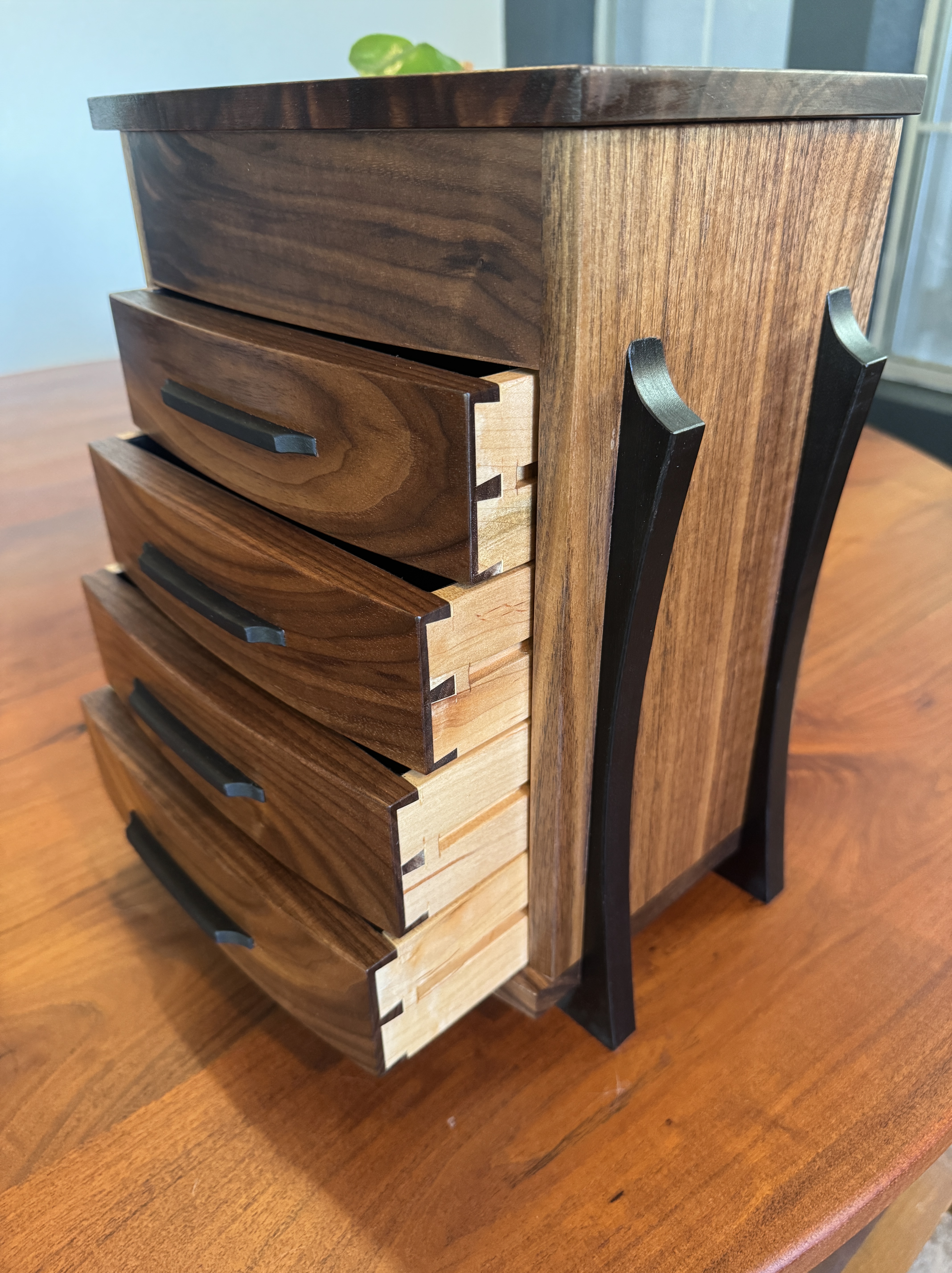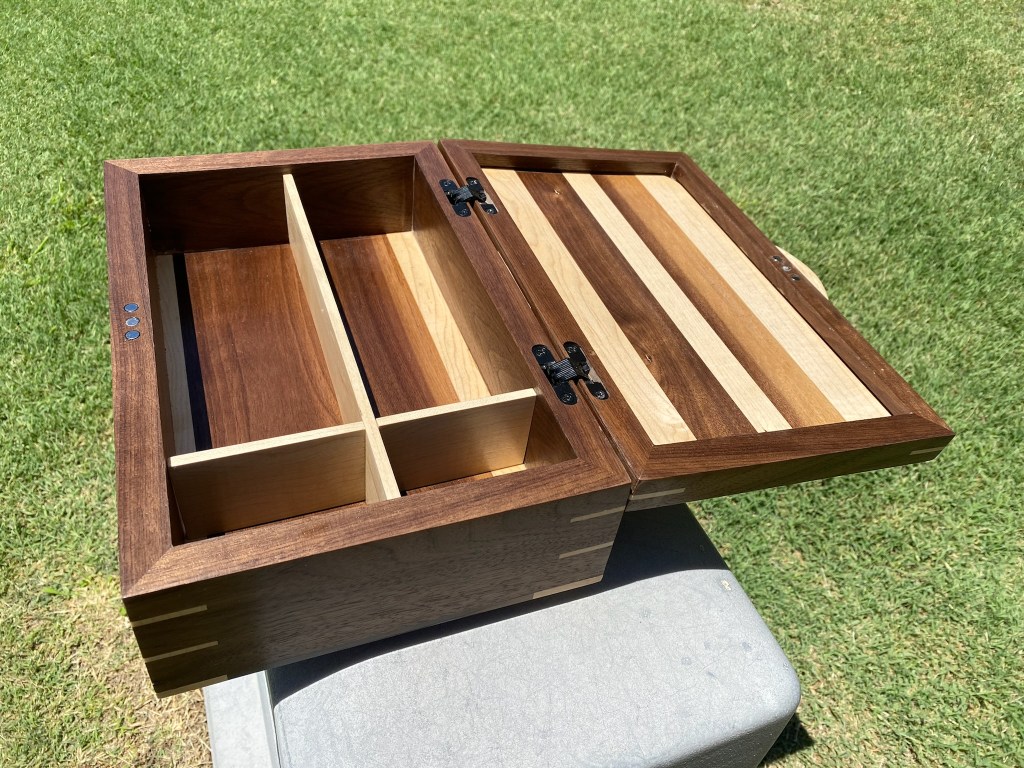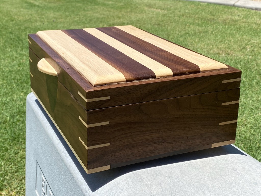 This is a beautiful jewelry box made from walnut and maple. The maple was given an india ink treatment. Everything was finished with Rubio Monocoat. The drawers are flocked with suede and of course the hinges are from Brusso. The figure on the lid really stands out and makes this piece shine.