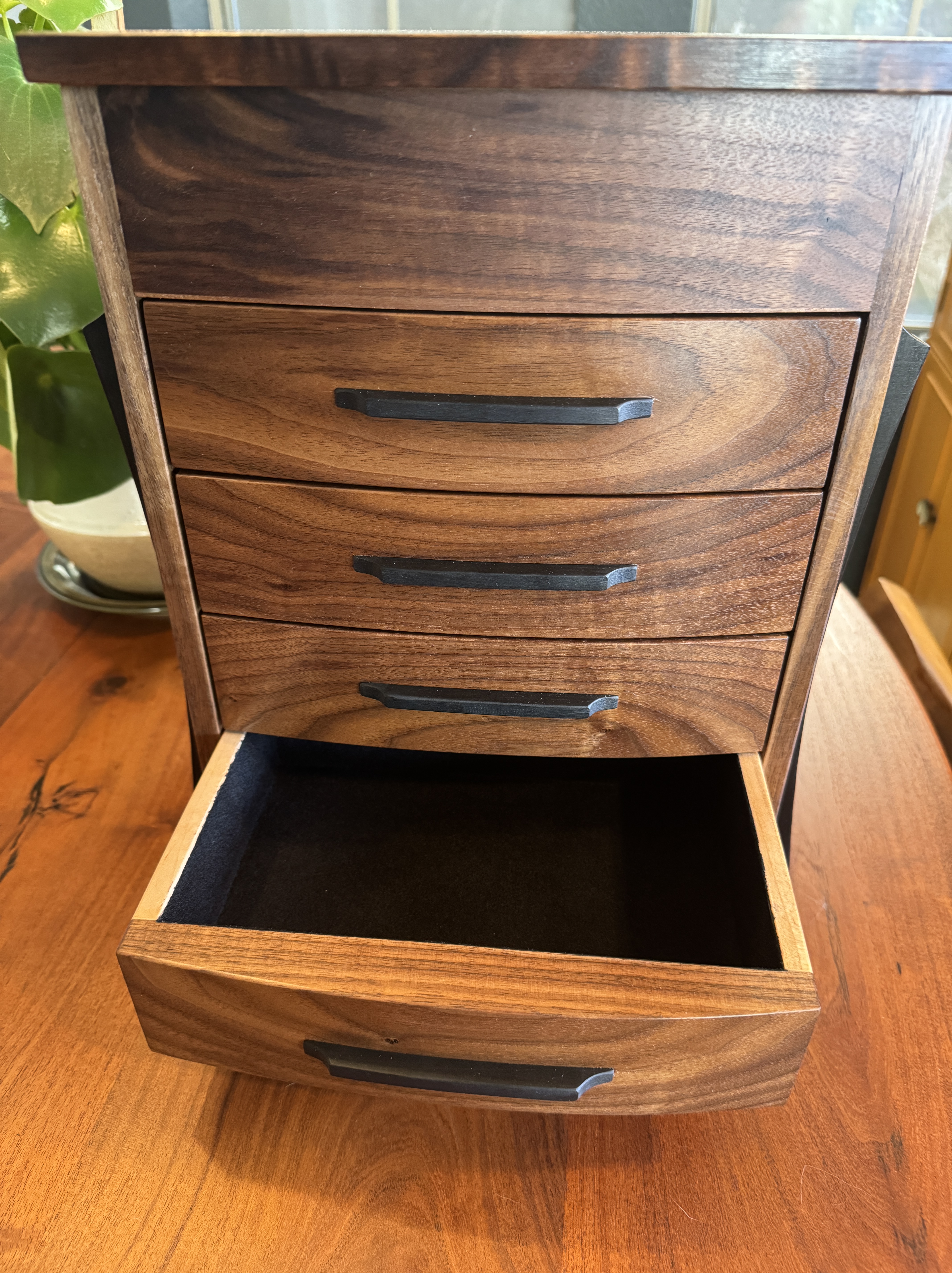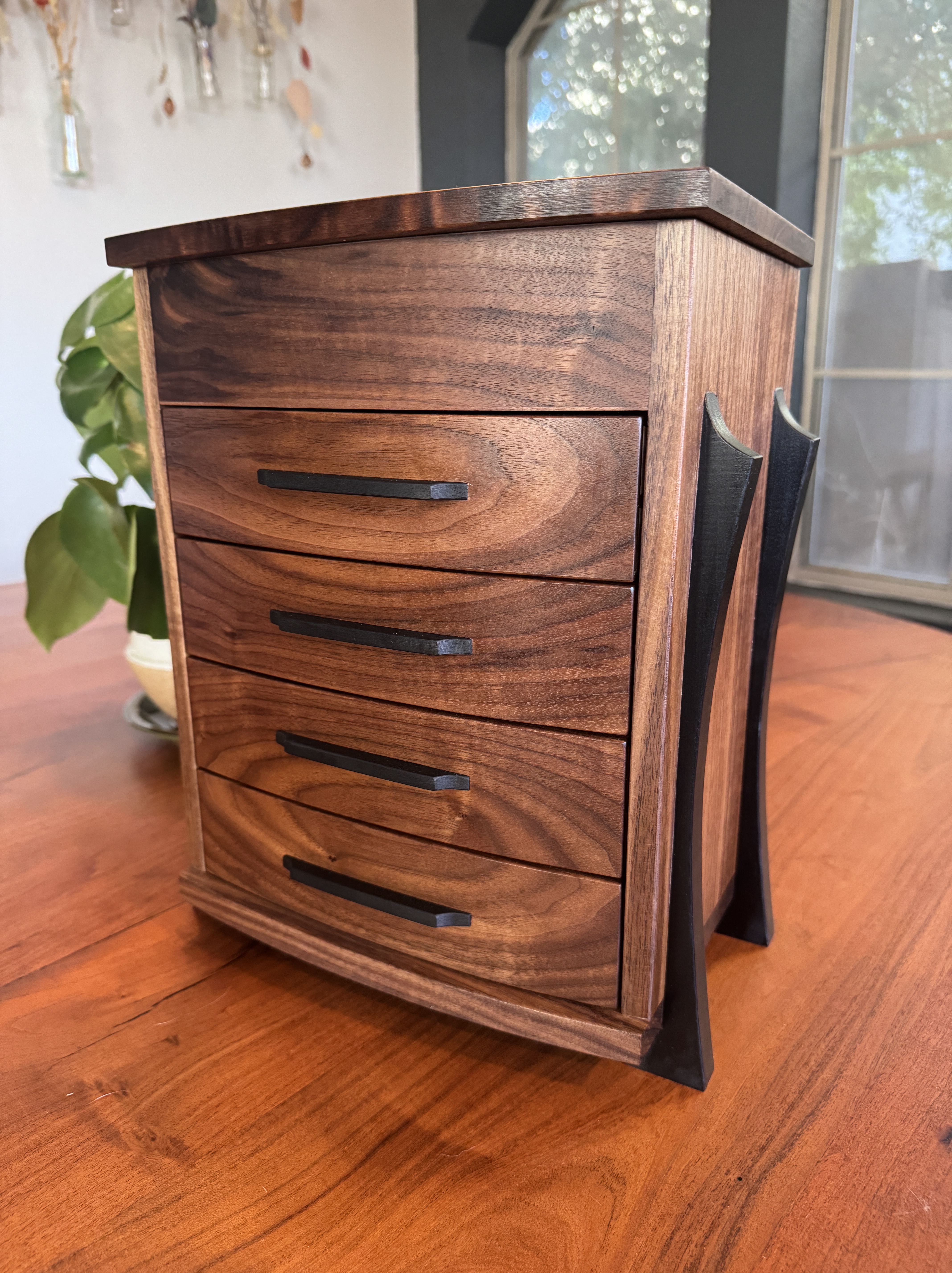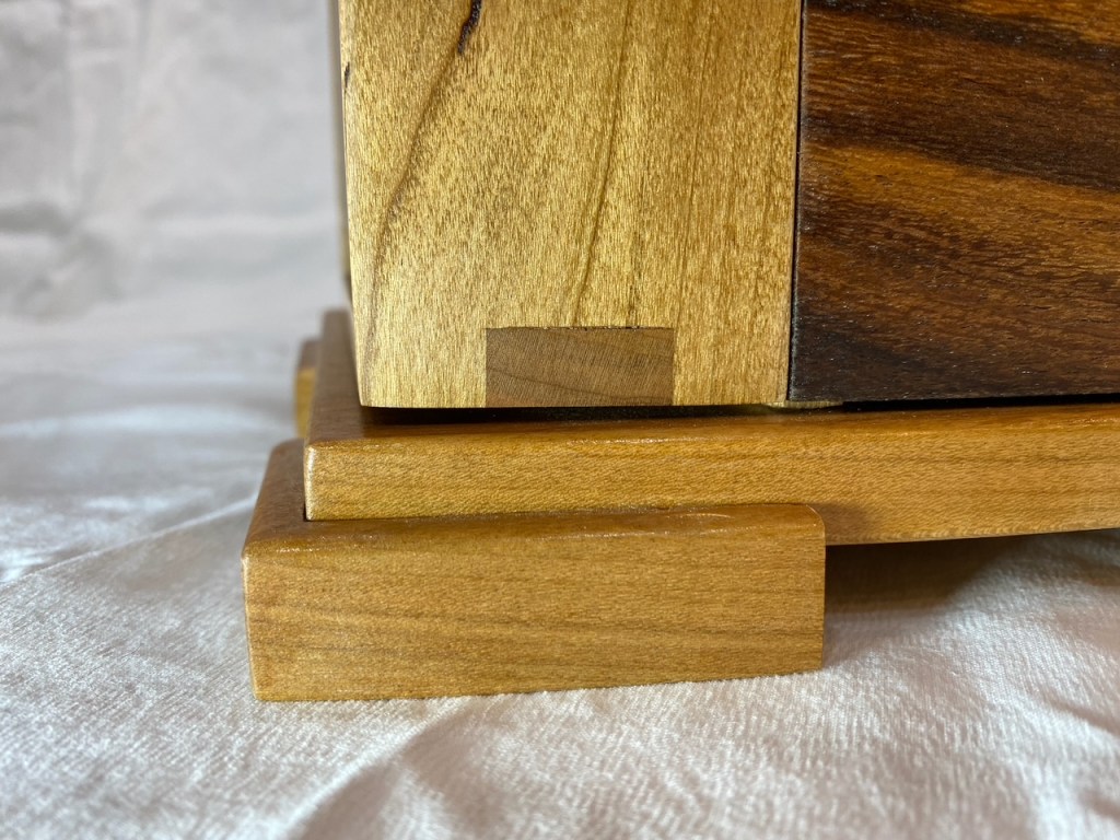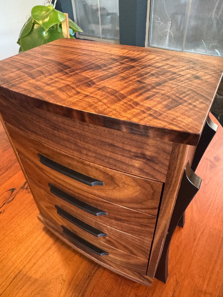 This is a beautiful jewelry box made from walnut and maple. The maple was given an india ink treatment. Everything was finished with Rubio Monocoat. The drawers are flocked with suede and of course the hinges are from Brusso. The figure on the lid really stands out and makes this piece shine.