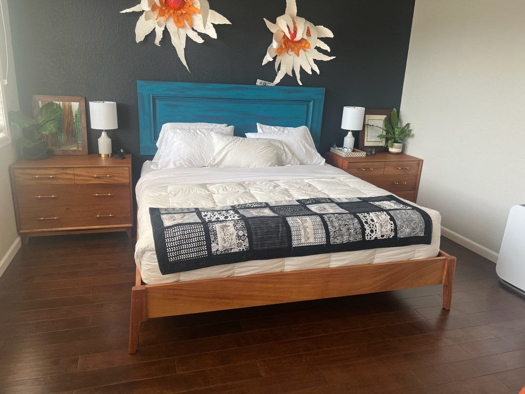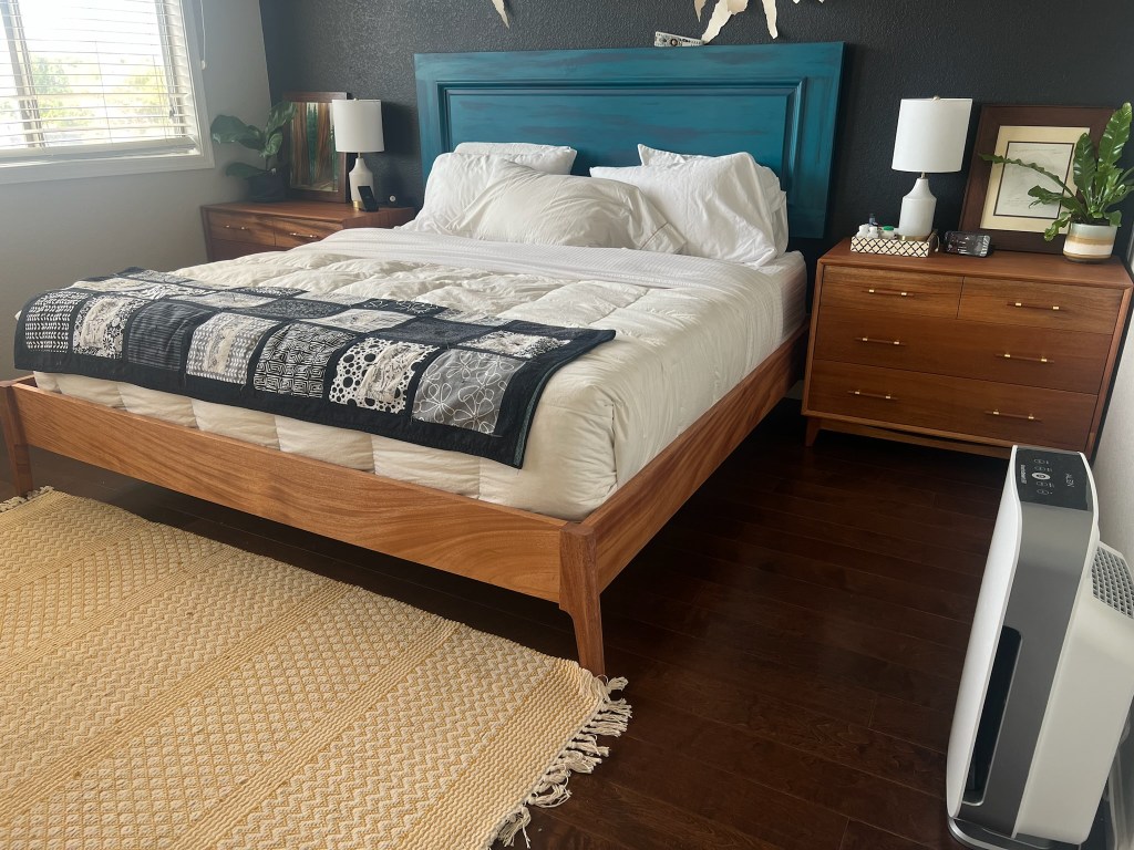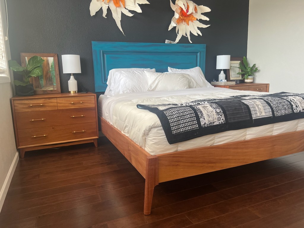 African Mahogany Bedroom Set. The bed frame is designed by Foureyes Furniture.
