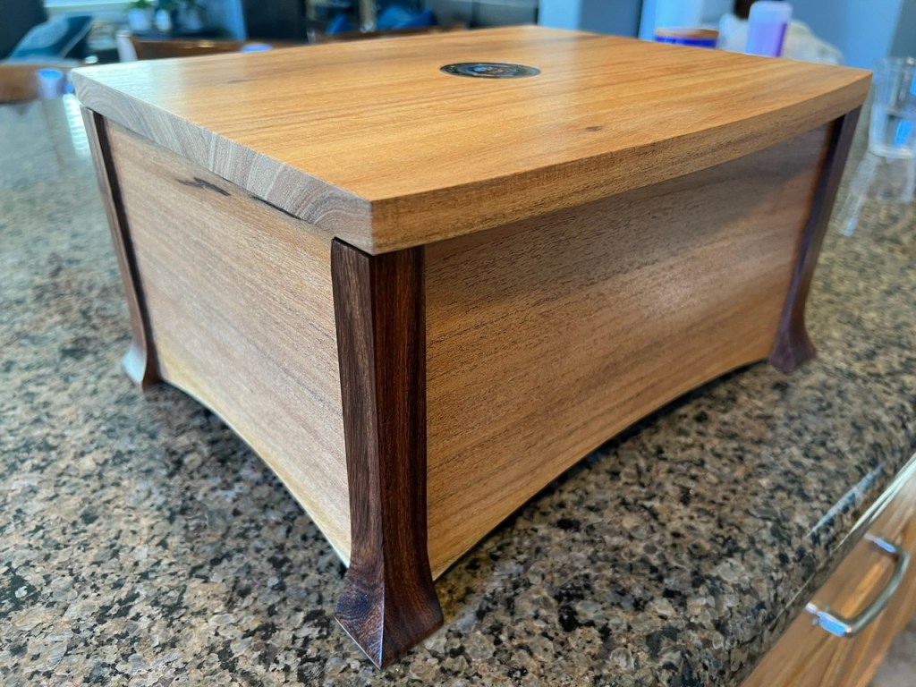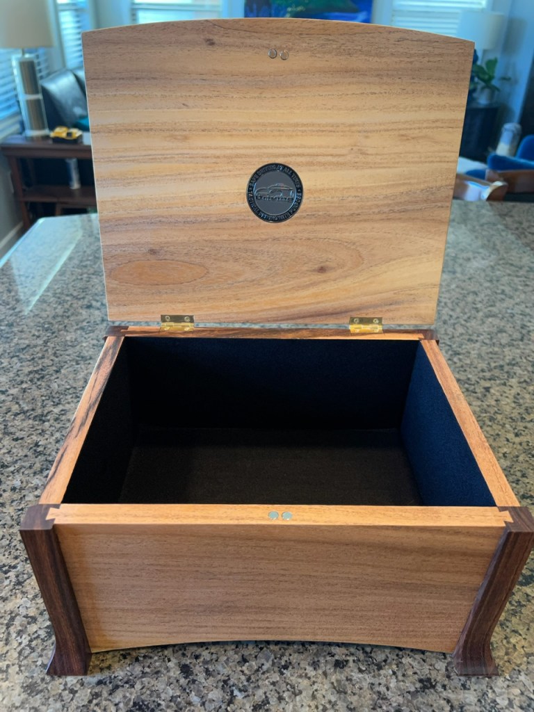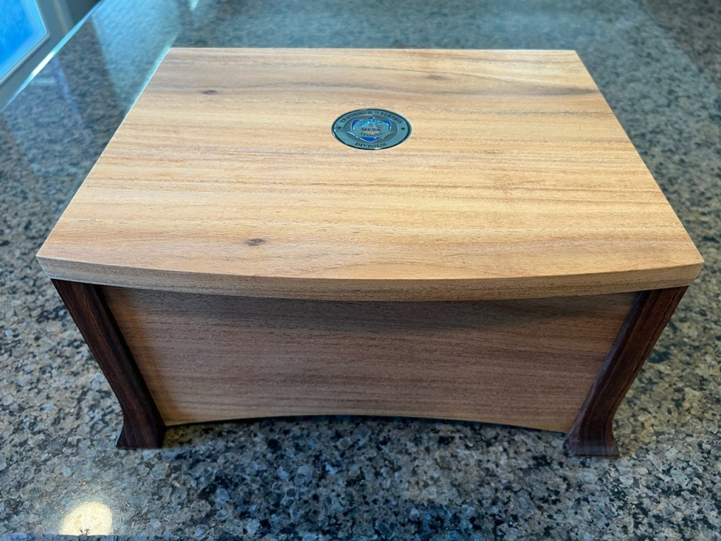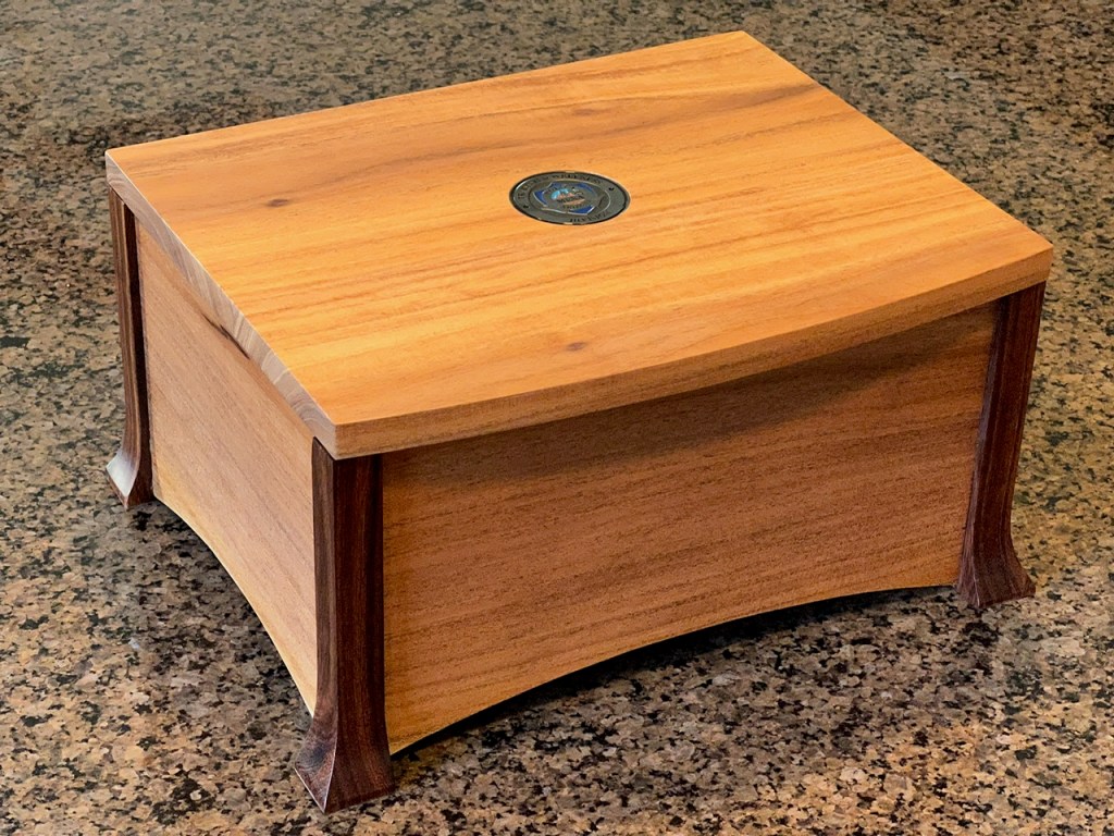 Retirement keepsake box with inlay challenge coin and suede interior, made from willow acacia and mesquite