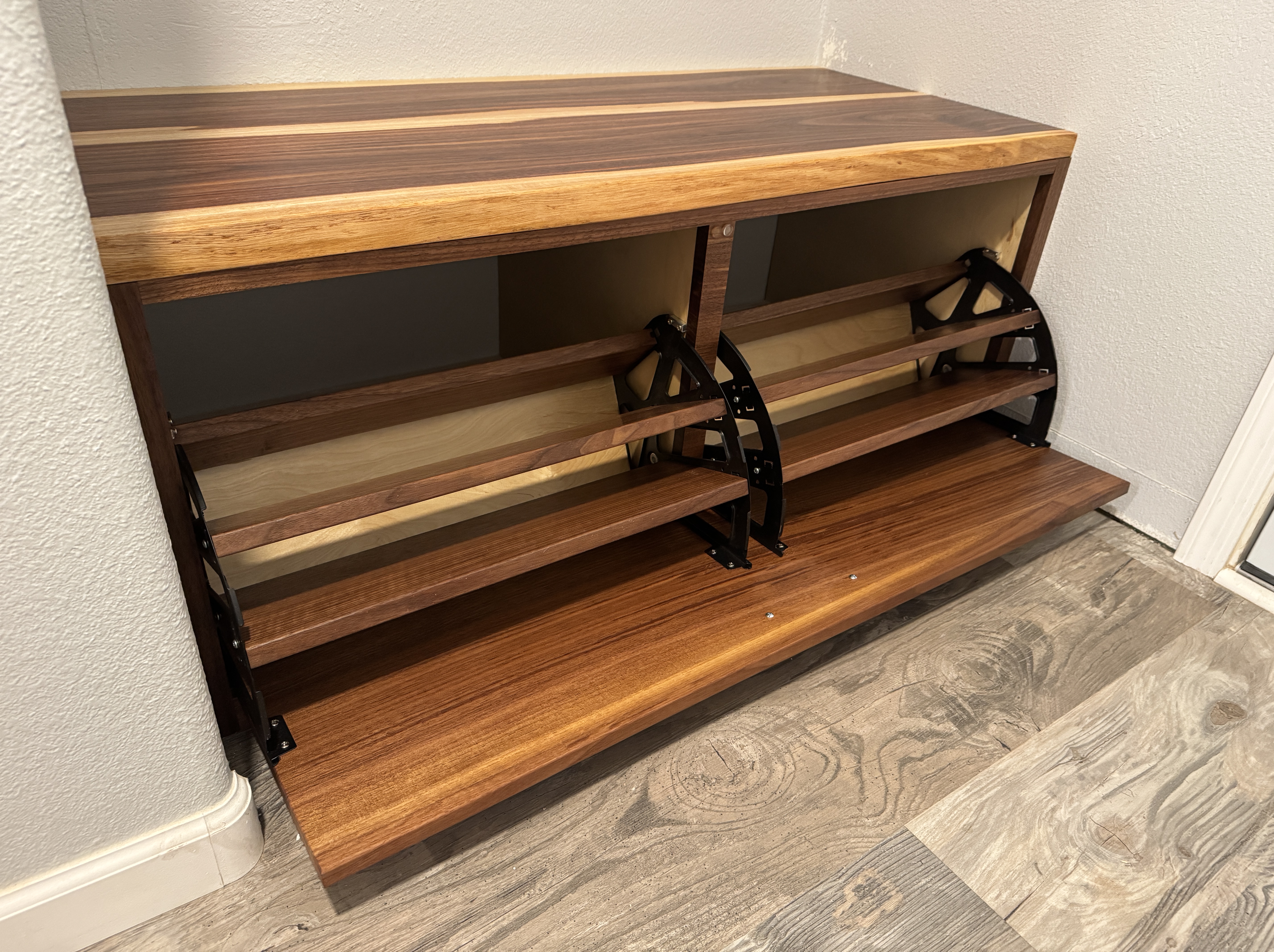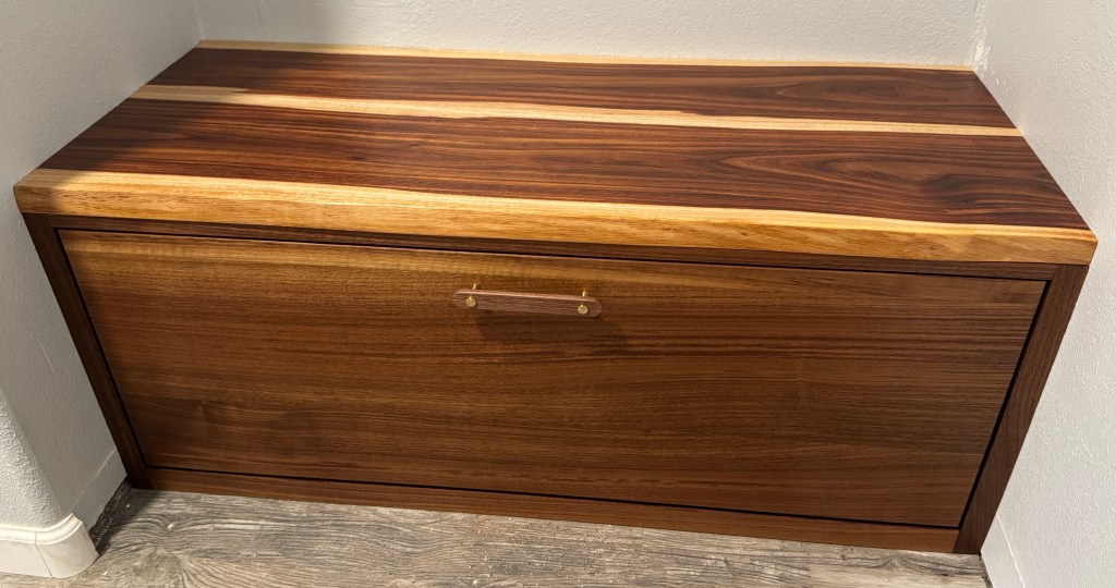 This is a commissioned piece designed to be a bench/shoe rack just inside the garage door. This is made from Walnut and live-edge slabs of Acacia. Finished with Rubio Monocoat and a beautiful brass and Walnut handle.