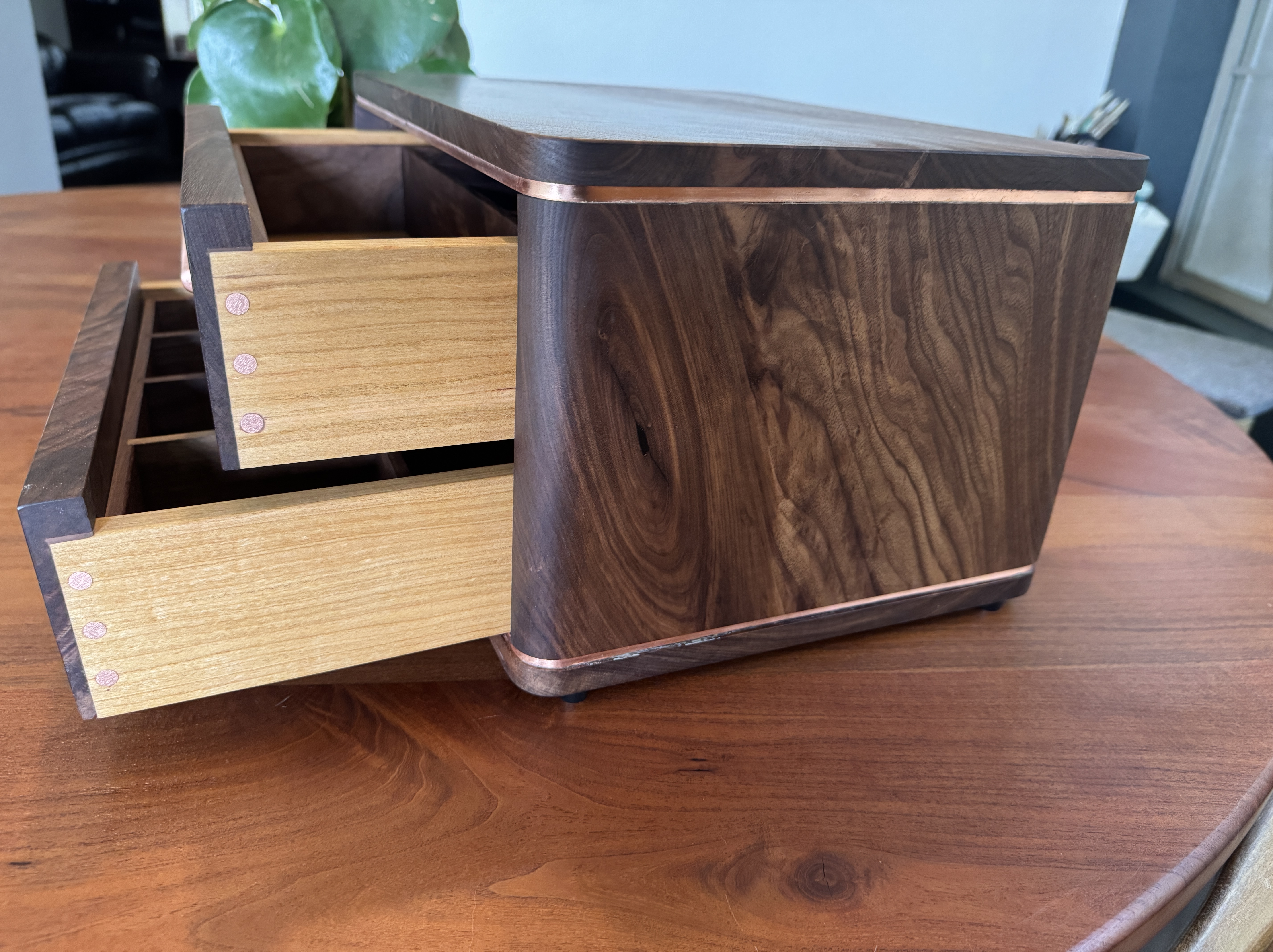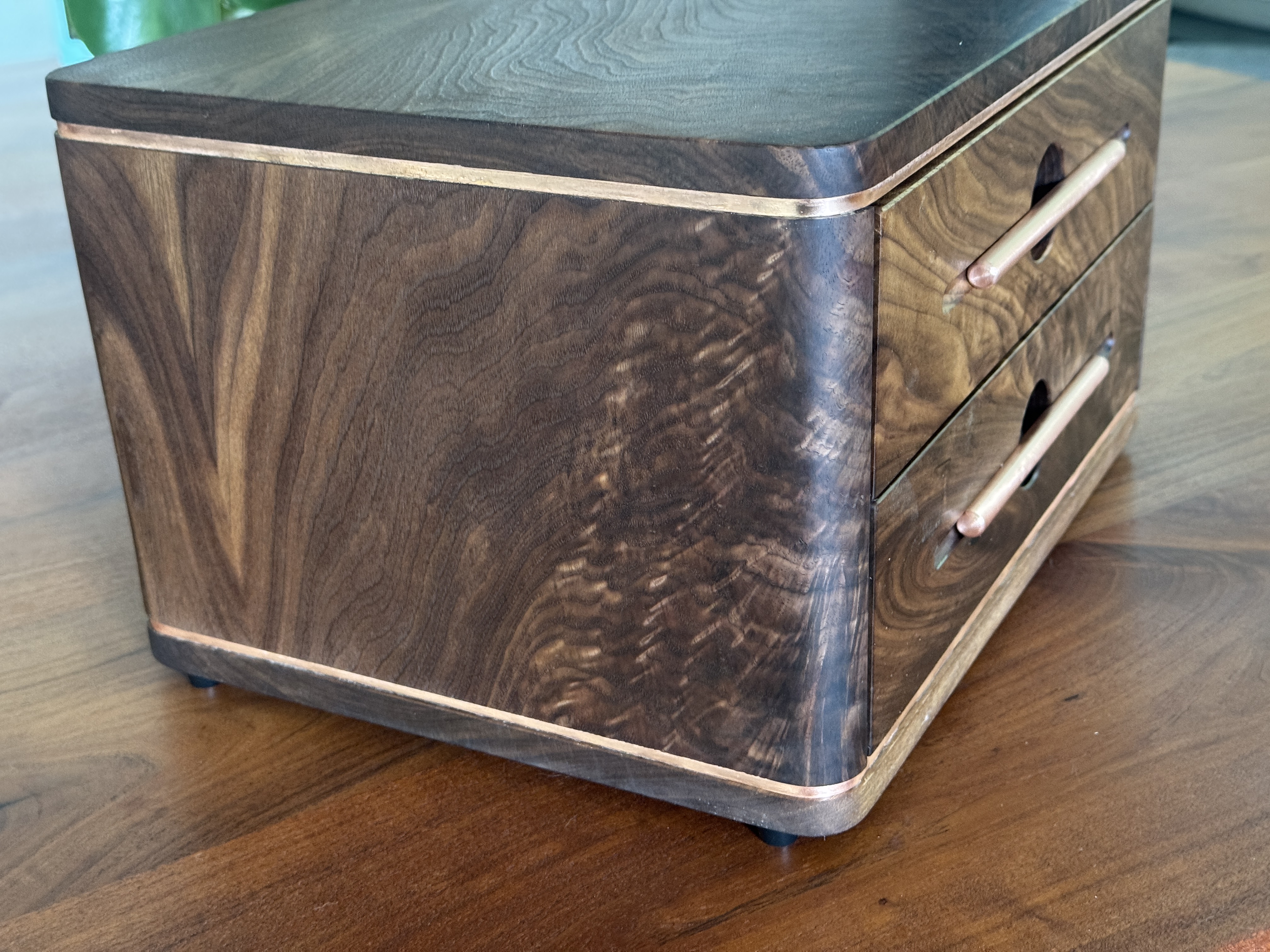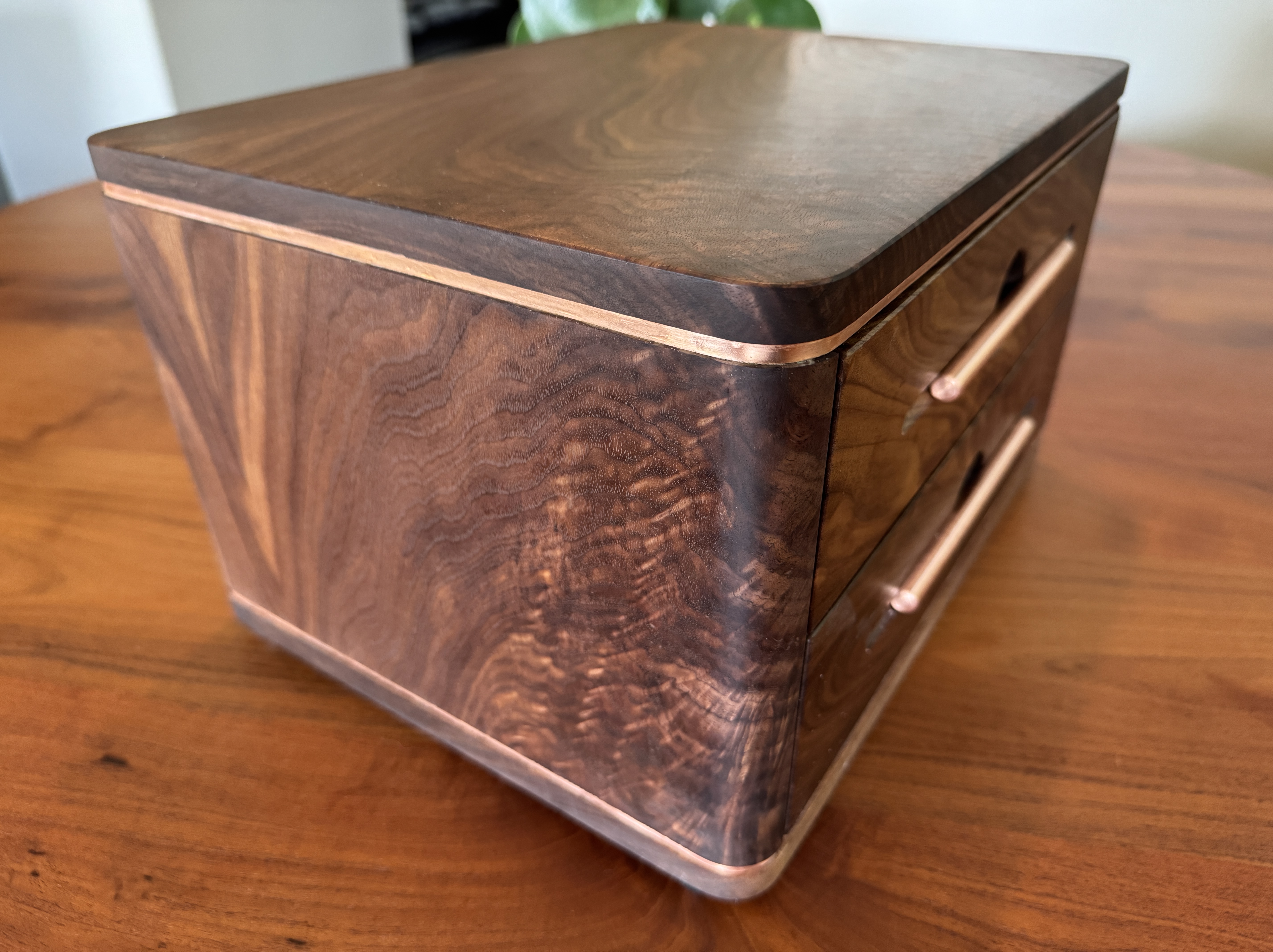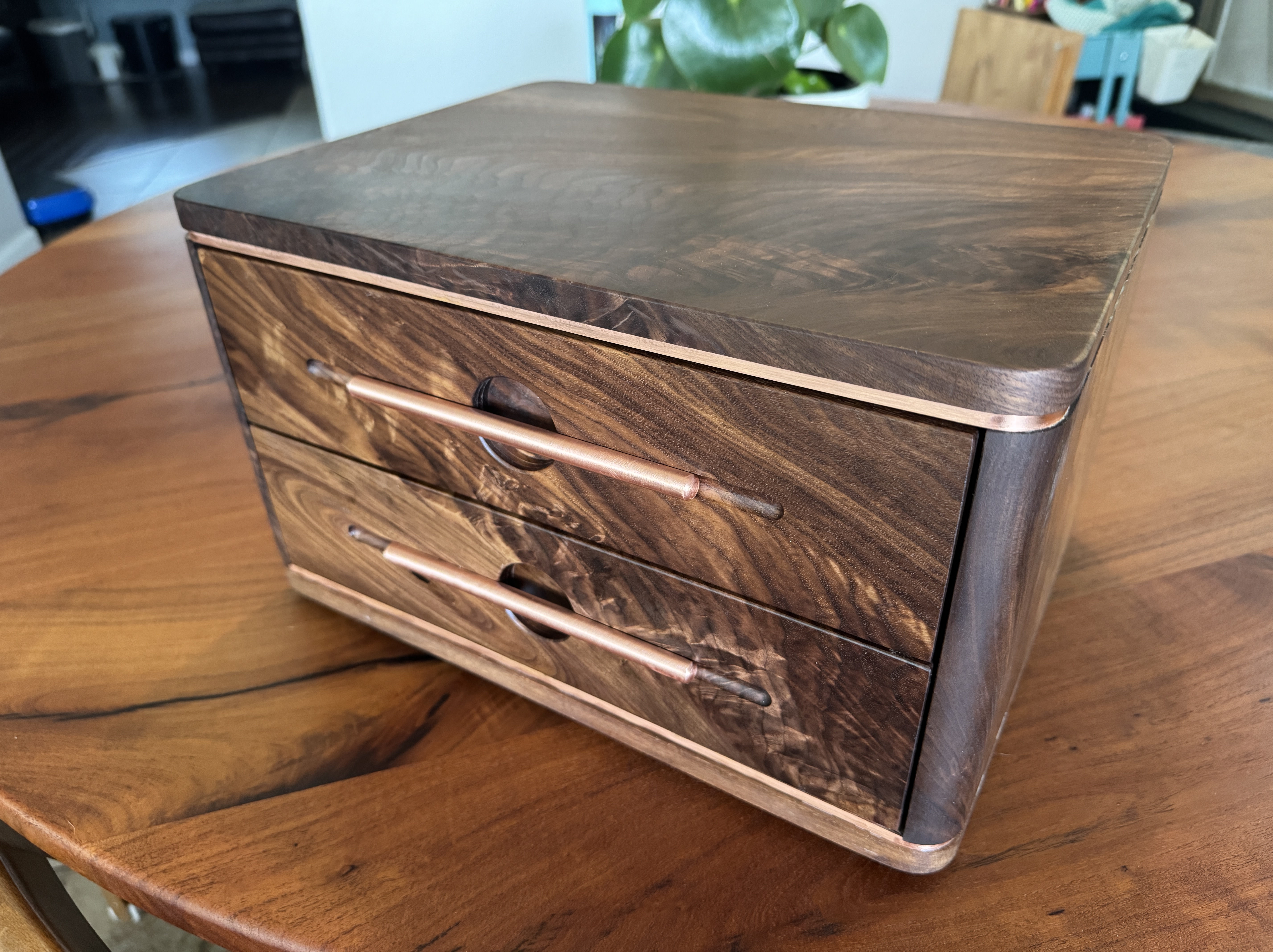 I decided to build something for my son, just because. As I was building this he passed a big test to obtain a license that will further his career. I am so proud of him! I did my best to completely copy an incredible builder, #pedullastudio , in making this box. The only real difference is that I lined the drawers with leather. The case is #walnut with copper accents. #customade#woodworking #rubiomonocoat #maker