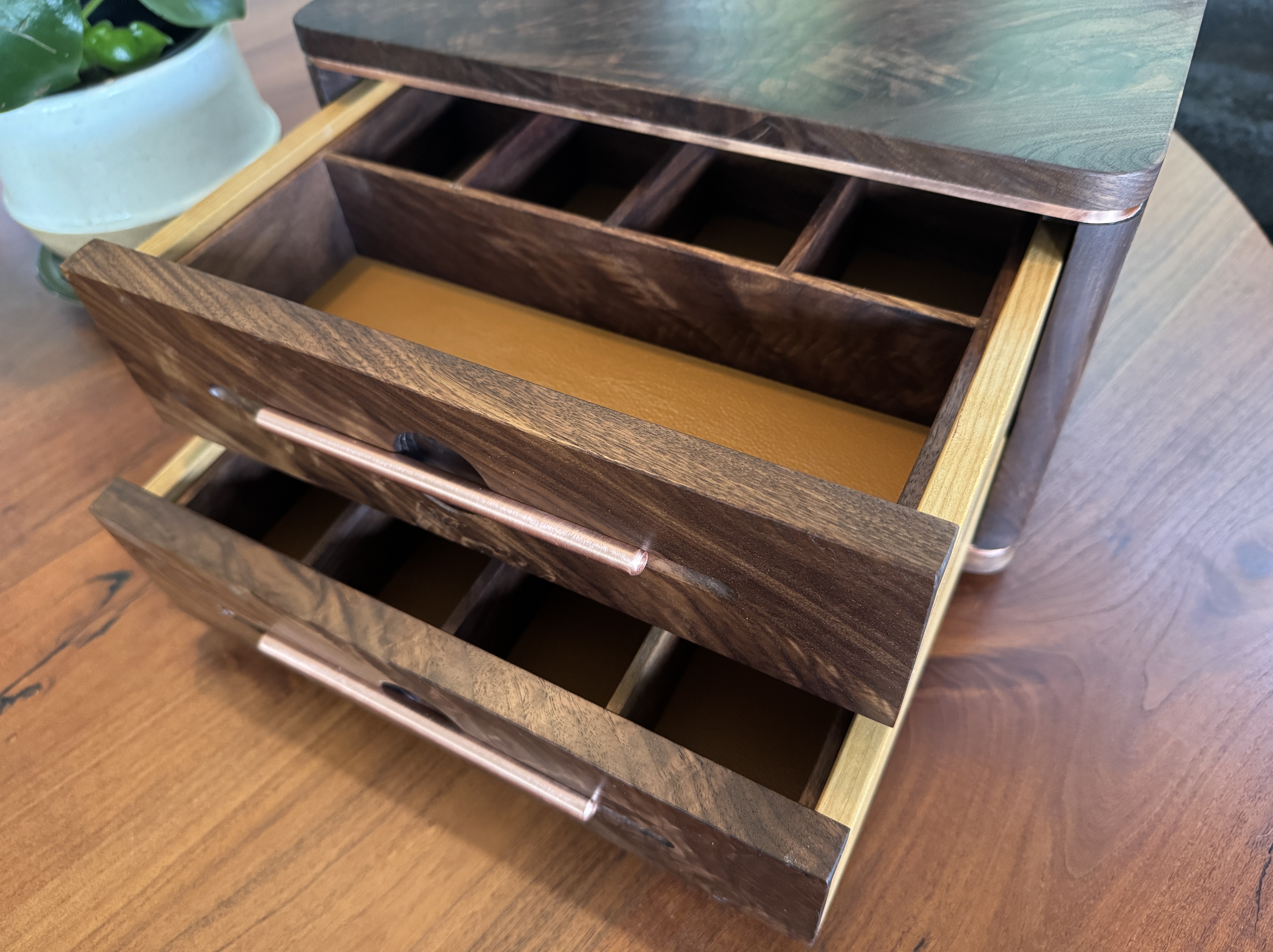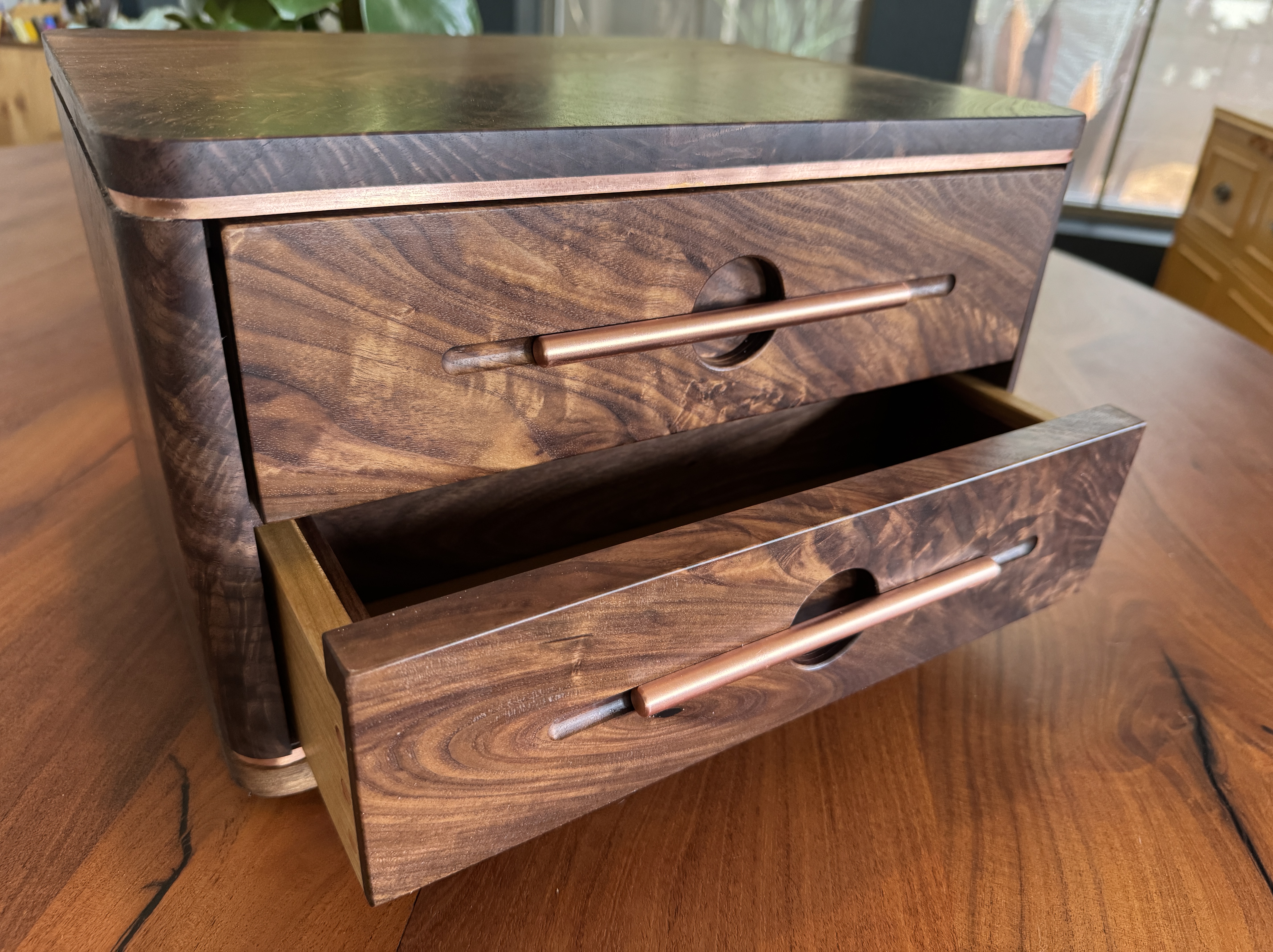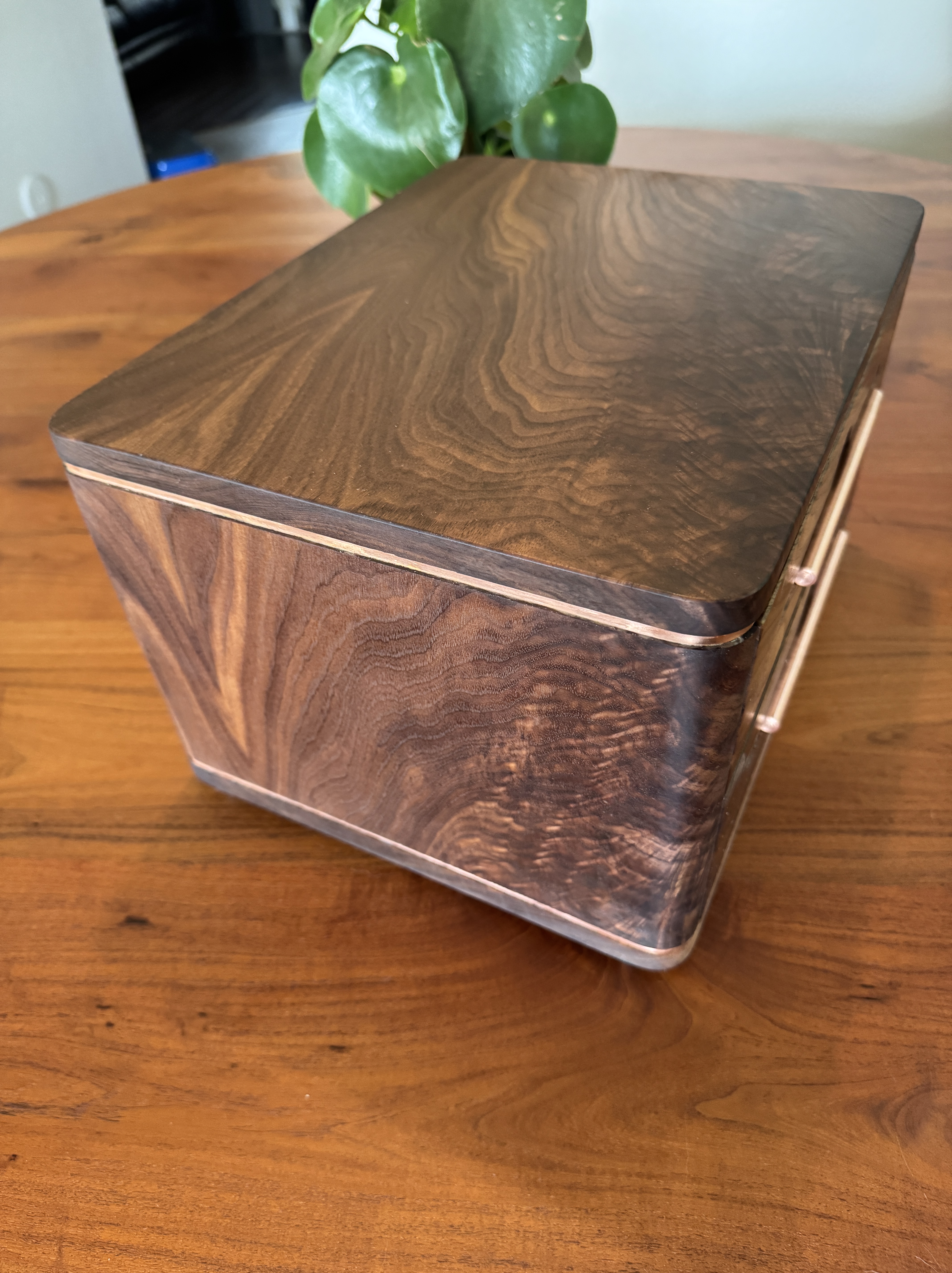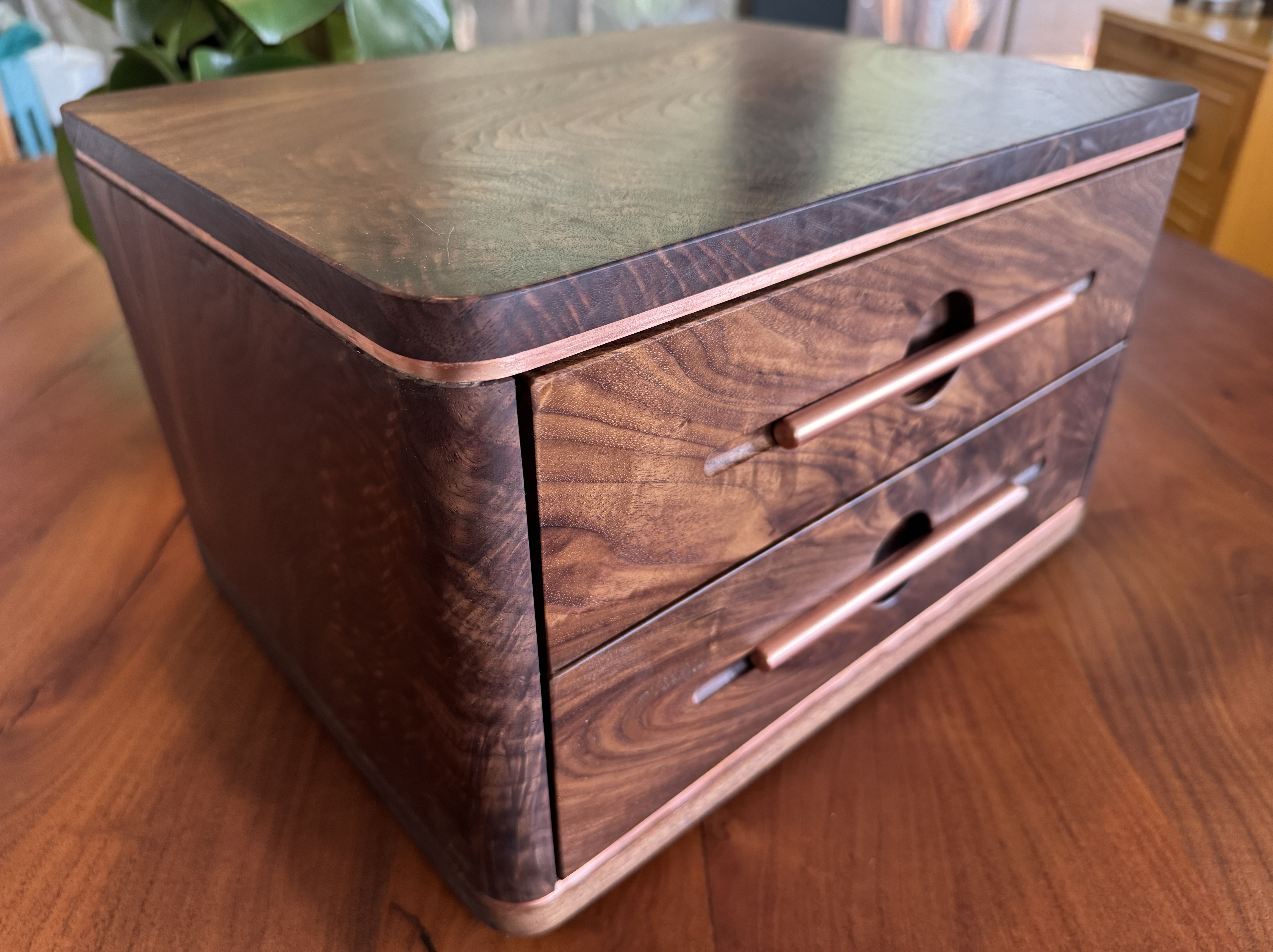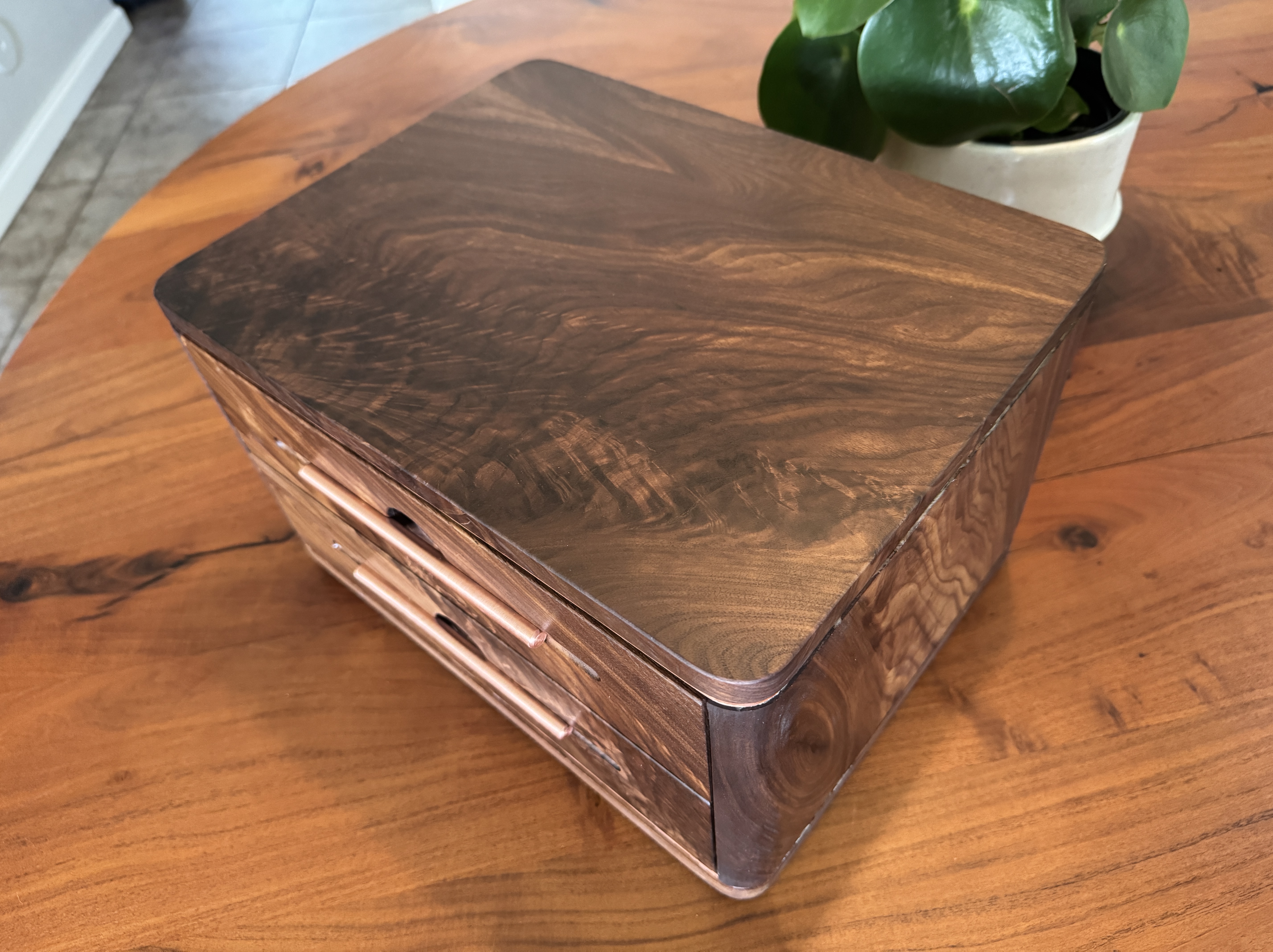 I decided to build something for my son, just because. As I was building this he passed a big test to obtain a license that will further his career. I am so proud of him! I did my best to completely copy an incredible builder, #pedullastudio , in making this box. The only real difference is that I lined the drawers with leather. The case is #walnut with copper accents. #customade#woodworking #rubiomonocoat #maker